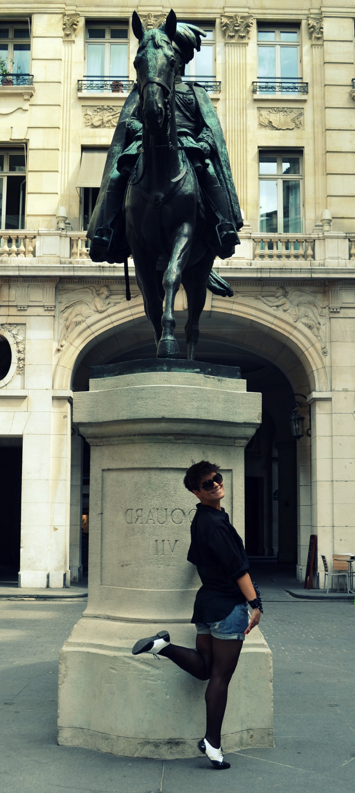 I found this awesome black/white macsuline shoes in some store in Paris and I could not resist them. Not only that I have bought them I immediatly had to include them in my next outfit so I pair them with black blouse from H&M, black tights and bright jeans shorts from New Yorker. Here are couple outfit pics made near some of the best Paris sights.